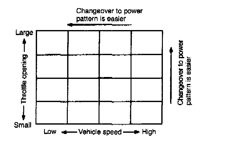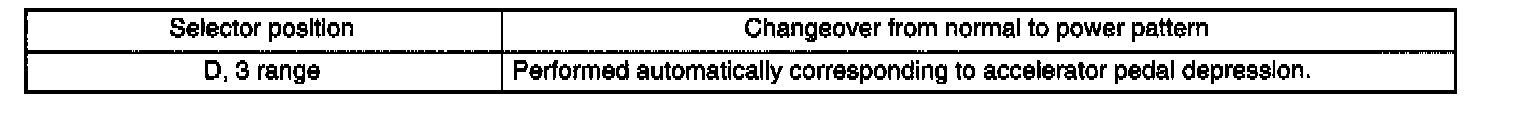 The power pattern is shifted to the normal pattern, depending on car speed. Shifting to the normal pattern is determined by the throttle position as shown in Figure. Time lag in shifting is also determined by car speed. The maximum time lag is 3 seconds.