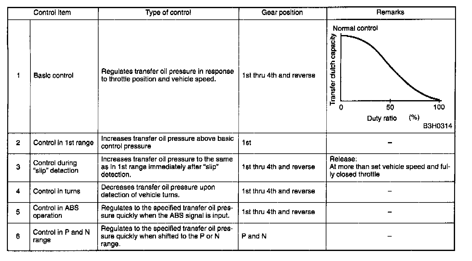 The hydraulic oil pressure (line pressure) is regulated by the duty solenoid C (transfer) and transfer control valve for obtaining optimum rear torque distribution corresponding to the driving conditions.