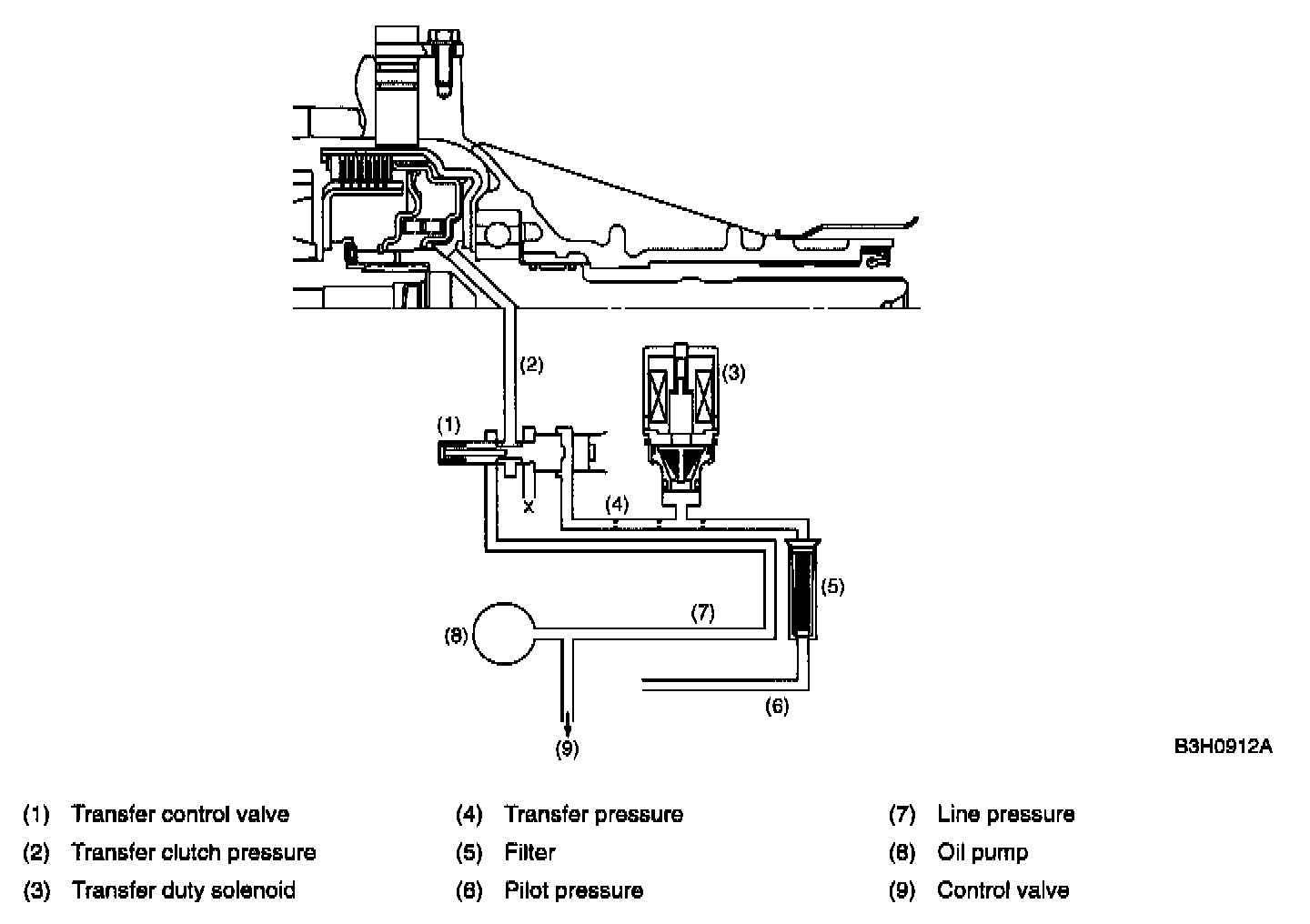 ^ The line pressure is led also to the transfer control valve where the pressure is regulated to the transfer clutch pressure by the transfer duty pressure. (The transfer clutch pressure varies with the transfer duty pressure.)