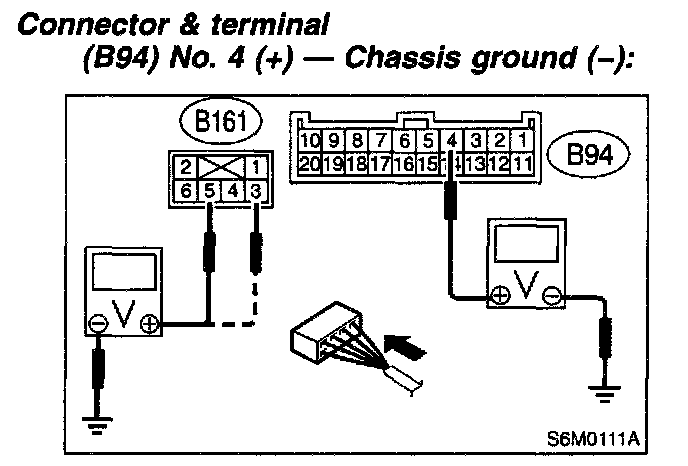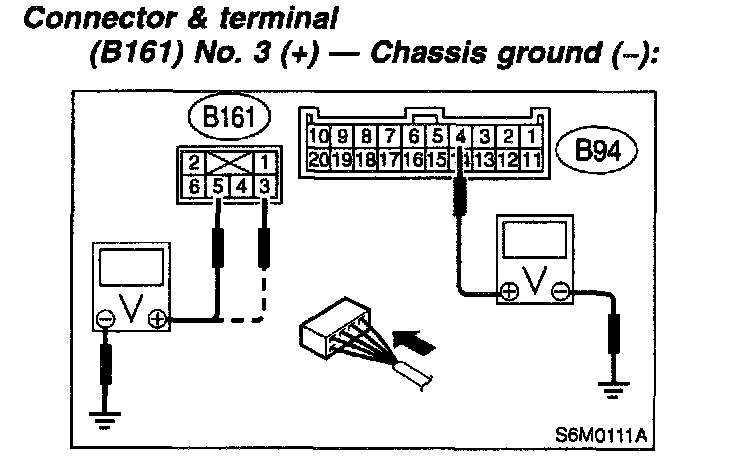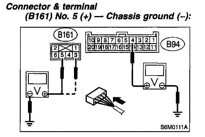 NOTE: Depress cruise control main switch with fingers while measuring voltage between (B161) No. 5 and chassis ground.