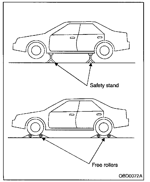 1. PREPARATIONS FOR THE INSPECTION MODERaise the vehicle using a garage jack and place on safety stands or drive the vehicle onto free rollers.