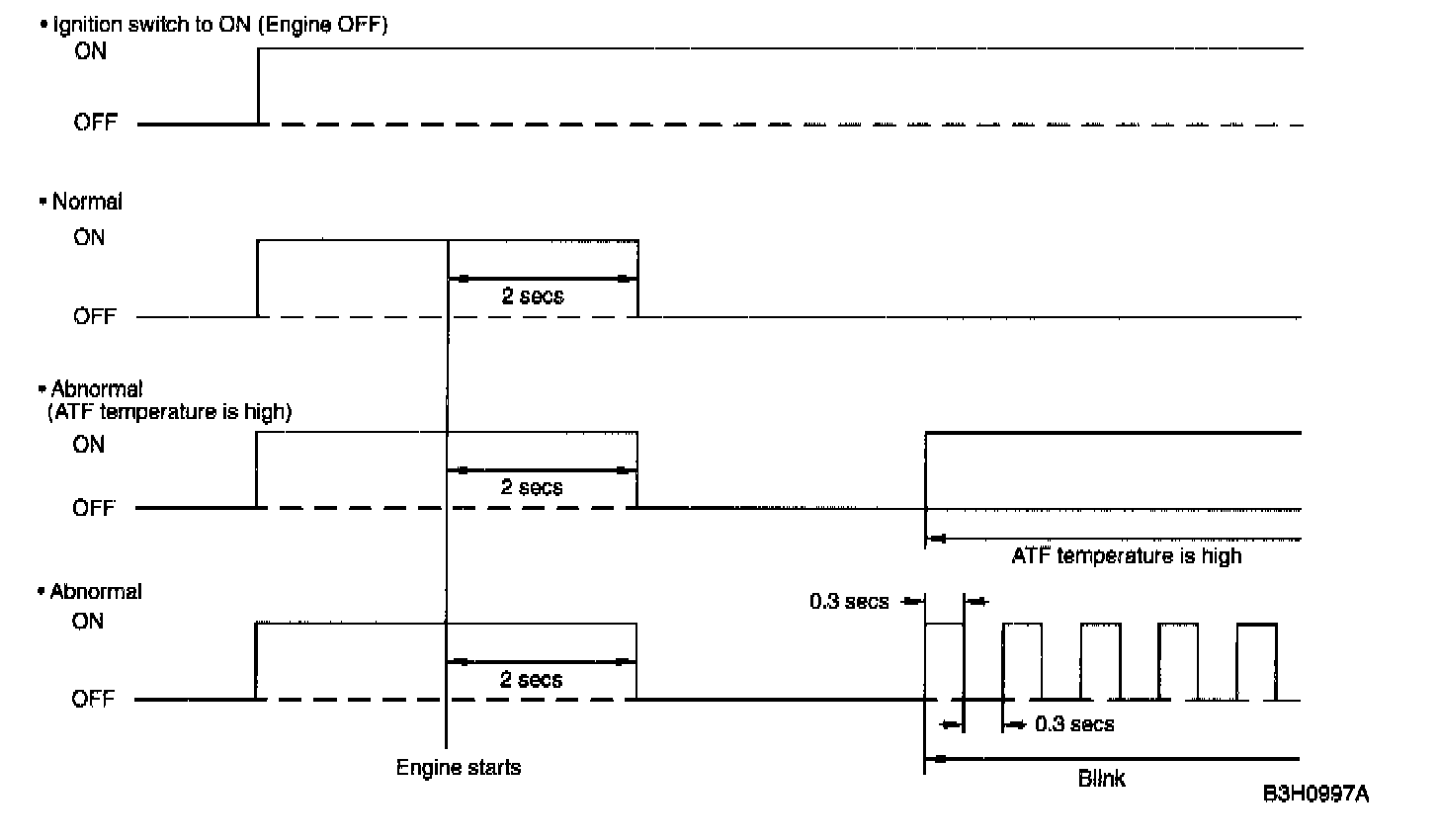 On starting the engine, AT OIL TEMP indicator lamp illuminates as shown below. If any trouble occurs, the lamp continues flashing until ignition switch is turned to ON position (engine turned off).
