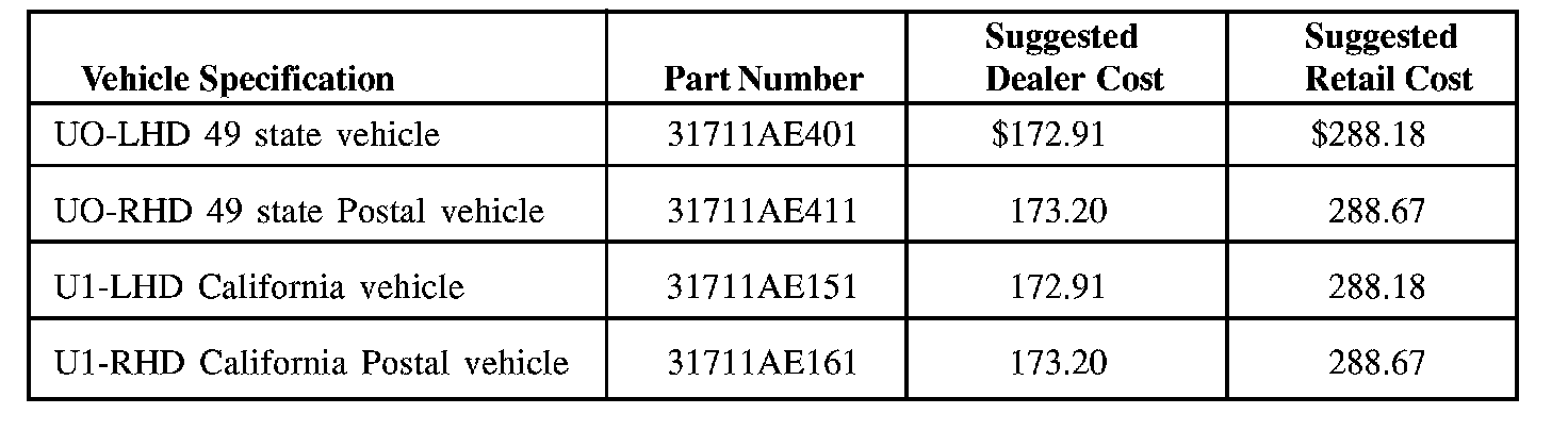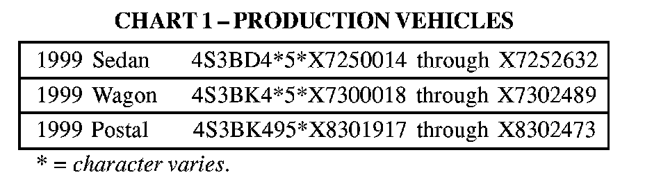 The potentially affected vehicles are 1999 Model Year Legacy sedan and wagon "L", Brighton, and Postal models equipped with automatic transmission and a 2.2L engine. Those vehicles are identified in Chart 1.