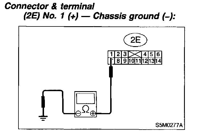 Measure resistance between test harness E connector (2E) terminals and chassis ground.