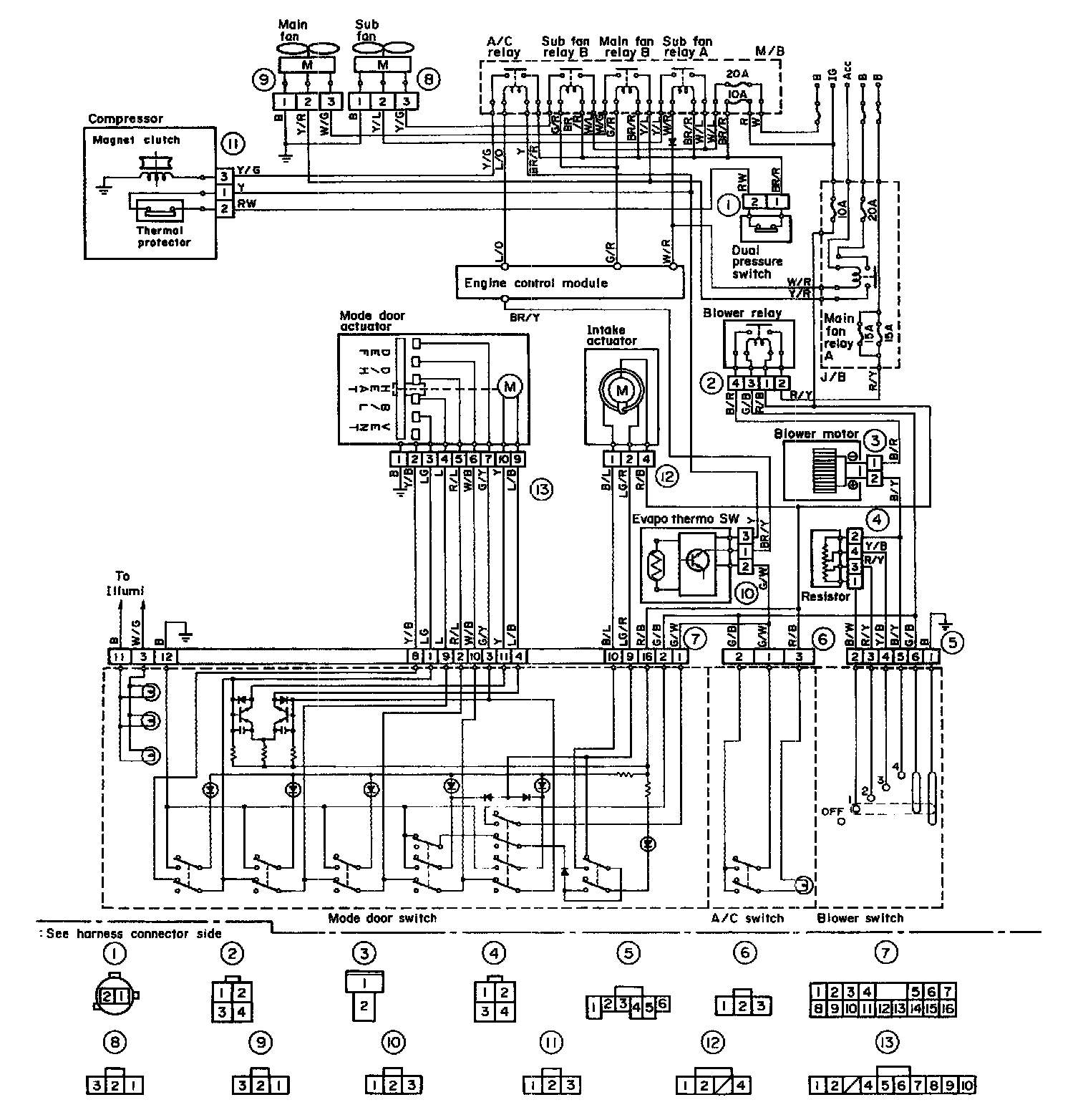 1. When the A/C switch and fan switch are turned ON, the A/C relay activates. The compressor is turned on, and then the main and sub fans also operate. Blower relay operates to direct the air flow rate determined by FAN switch position.