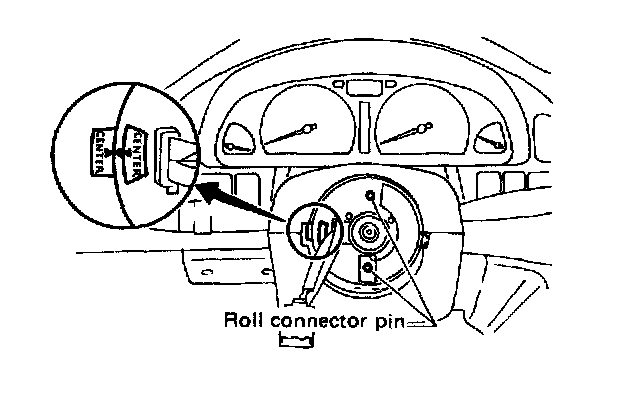 CAUTION: Insert roll connector guide pin into guide hole on lower end of surface of steering wheel to prevent damage. Draw out airbag system connector, horn connector and cruise control connectors from guide hole of steering wheel lower end.