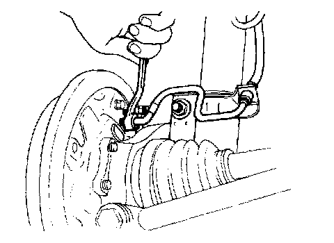 6) Remove disc brake caliper from back plate, and suspend it from strut using a piece of wire.