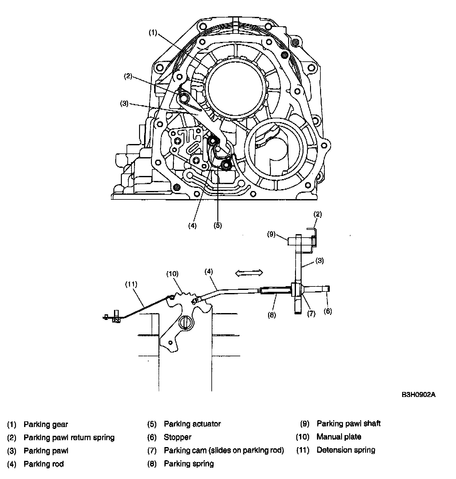 Parking MechanismThe end of the parking pawl engages mechanically with the gear groove of the parking gear. This gear is spline-fitted to the drive pinion shaft.