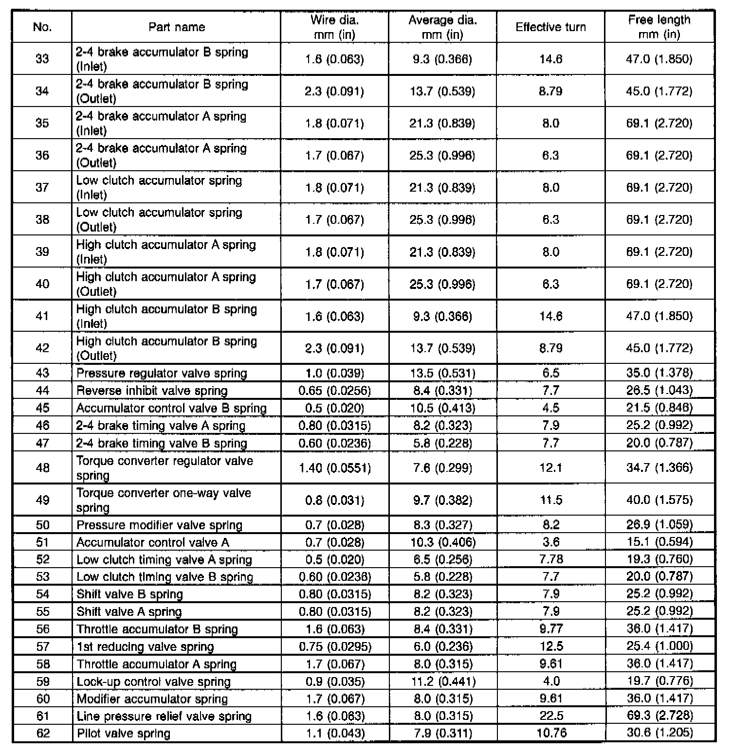 The control valve is composed of parts which are accurately machined to a high degree and should be handled carefully during disassembly and assembly. As these parts are similar in shape, they should be arranged in neat order on a table after disassembly so that they can be easily installed to their original positions. Spring loaded parts should be also handled carefully, as springs may jump out of place when the parts are disassembled or removed. Extreme care should be taken so as not to drop valves on the floor. Before assembling, the parts and valves should be dipped in a container filled with the ATF. Make sure that the valves are clean and free from any foreign material before assembly. Torque specifications should also be observed.