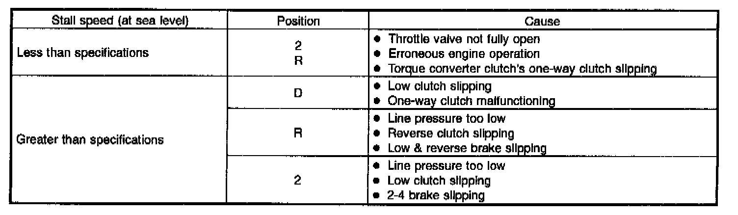 - If the stall speed is higher than the specified range, attempt to finish the stall test in as short a time as possible, in order to prevent the automatic transmission from sustaining damage.