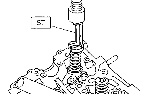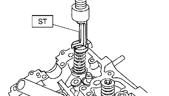2. Set ST on valve spring. Compress valve spring and remove the valve spring retainer key. Remove each valve and valve spring.