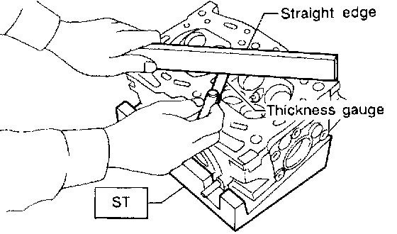3. Measure the warping of the cylinder head surface that mates with crankcase using a straight edge and thickness gauge.