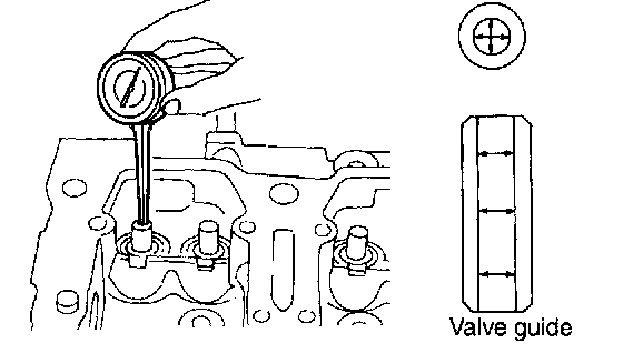2. If the clearance between valve guide and stem exceeds the limit, replace valve guide or valve itself whichever shows greater amount of wear. See following procedure for valve guide replacement.