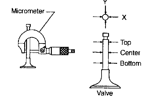 1. Check the clearance between valve guide and stem. The clearance can be checked by measuring the outside diameter of valve stem and the inside diameter of valve guide with outside and inside micrometers respectively.