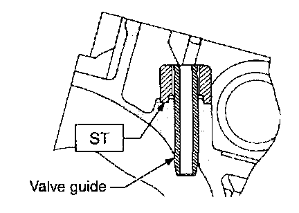 e. Put new valve guide, coated with sufficient oil, in cylinder, and insert ST1 into valve guide. Press in until the valve guide upper end is flush with the upper surface of ST2.