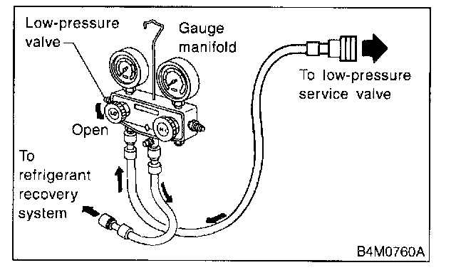 3. Open low-pressure manifold gauge valve slightly, and slowly discharge refrigerant from system.