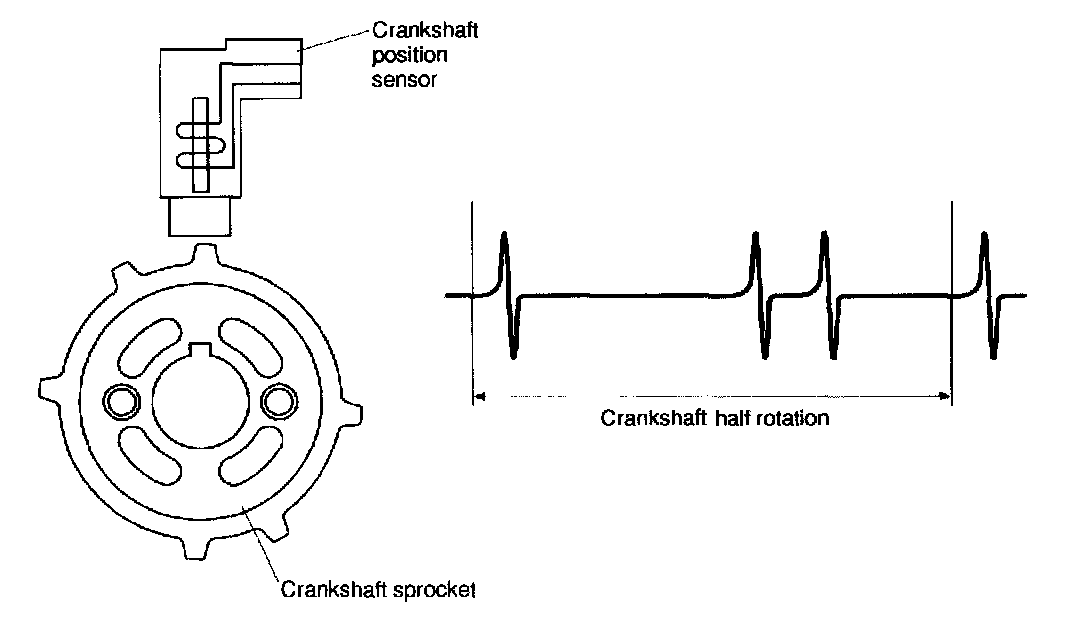 - Crankshaft rotation causes these protrusions to cross the crankshaft position sensor so that magnetic fluxes in the coil change with the change in air gap between the sensor pickup and the sprocket. The change in air gap induces an electromotive force which is transmitted to the ECM.