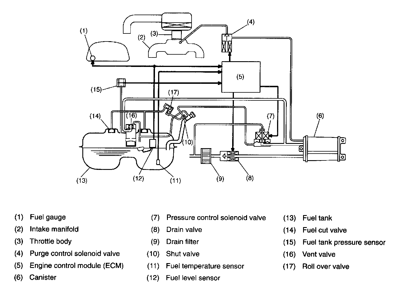 - The evaporative emission control system is employed to prevent evaporative fuel from being discharged into ambient atmosphere. This system includes a canister, purge control solenoid valve, fuel cut valve, their connecting lines, etc.