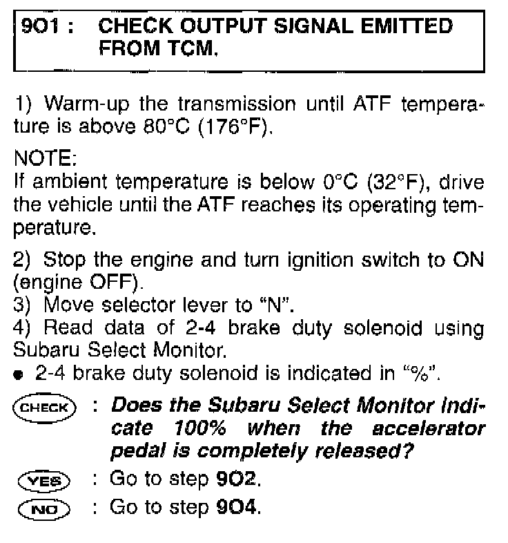 O: CHECK 2-4 BRAKE DUTY SOLENOID.9O1: CHECK OUTPUT SIGNAL EMITTED FROM TCM.