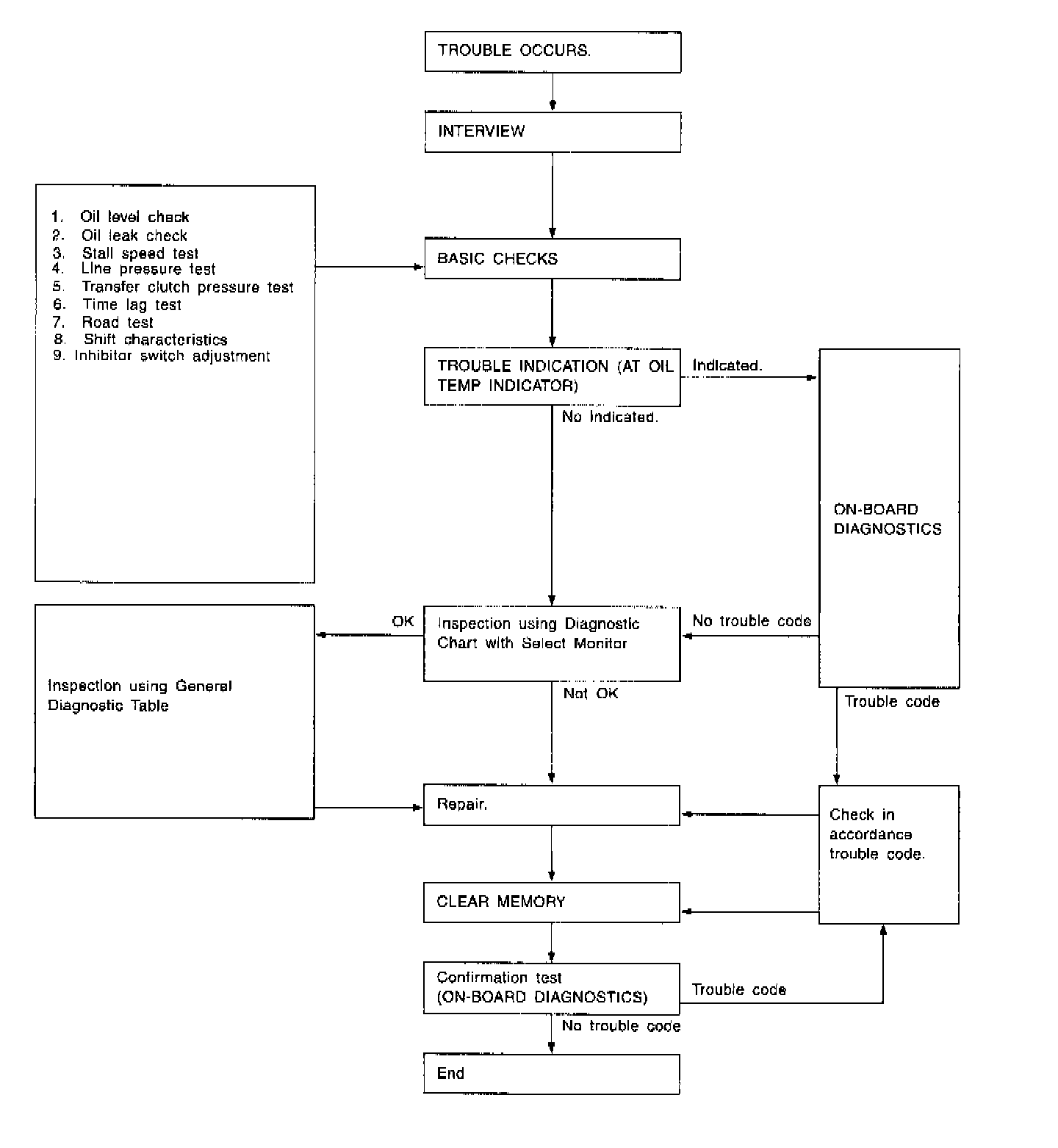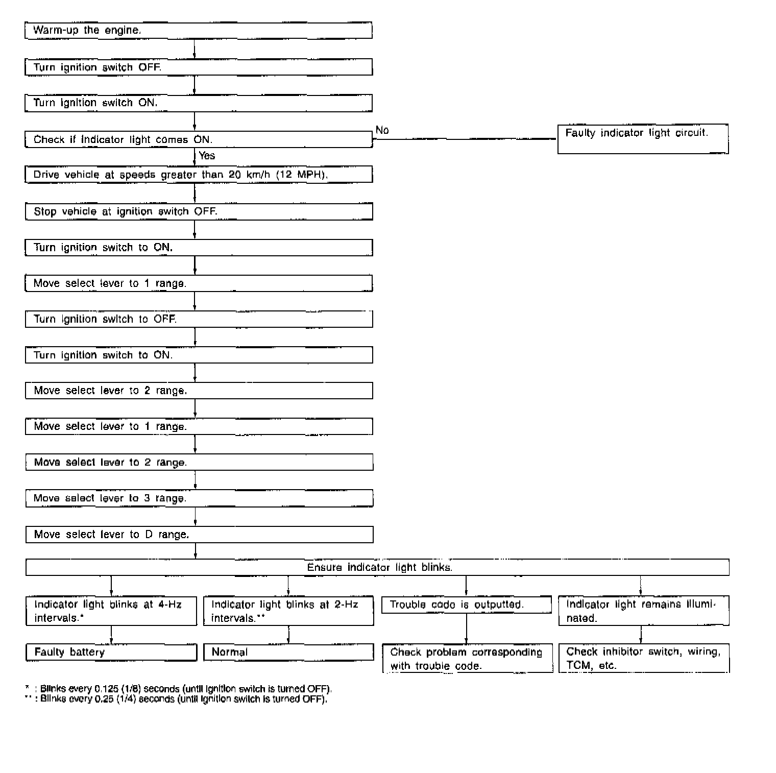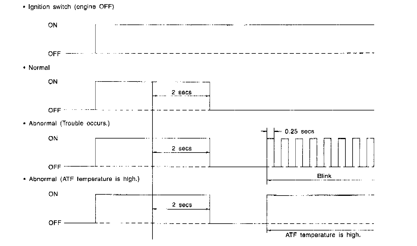 When any on-board diagnostics item is malfunctioning, the display on the AT OIL TEMP indicator lamp blinks from the time the malfunction is detected after starting the engine until the ignition switch is turned OFF. The malfunctioning part or unit can be determined by a trouble code during on-board diagnostics operation. Problems which occurred previously can also be identified through the memory function. If the AT OIL TEN indicator does not show a problem (although a problem is occurring), the problem can be determined by checking the performance characteristics of each sensor using the select monitor. Indicator signal is as shown in the figure.