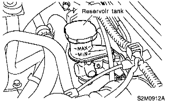 1) Check fluid level using a scale on outside of reservoir tank. If the level is below "MIN", add brake fluid to bring it up to "MAX".