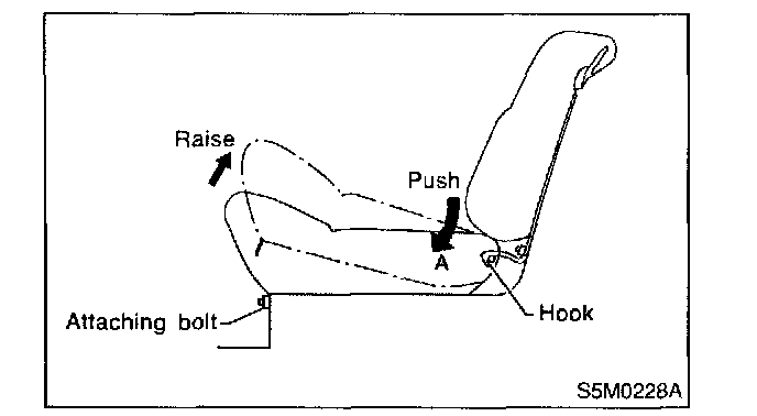 2. Slightly raise front of cushion while pushing down on cushion in the direction of "A". With cushion held in that position, move it forward until it is unhooked.