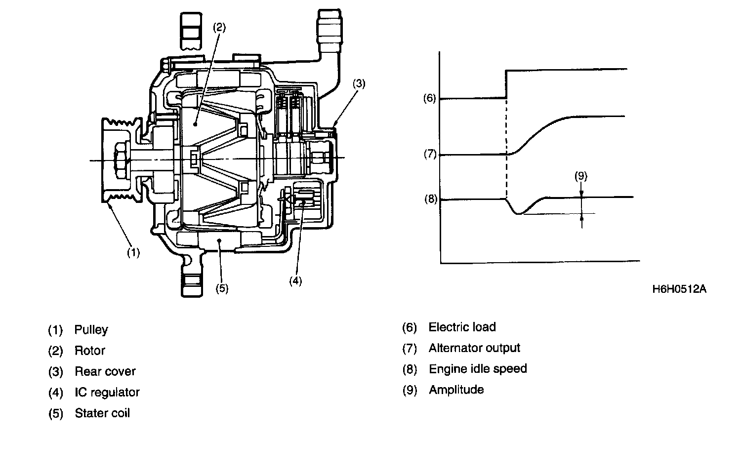 The generator incorporates an IC regulator which features a "load response control". The load response control circuit function to gradually increase the generator output when an additional electric load such as headlights or blower fan is applied to the engine in the idling state. This prevents a sharp drop in engine idling speed and ensures an improved comfort while the engine is idling.