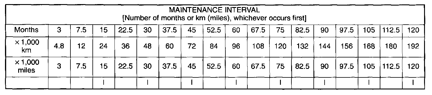 Inspect every 50,000 km (30,000 miles) or 24 months, whichever occurs first.