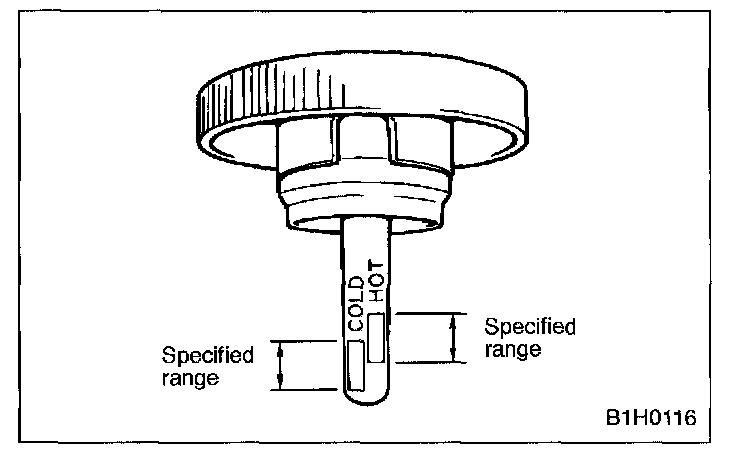 3. Fluid level should be maintained in the each specified range on the indicator of filler cap. If fluid level is at lower point or below, add fluid to keep the level in the specified range of indicator.