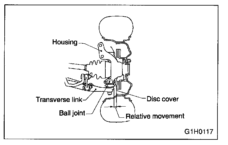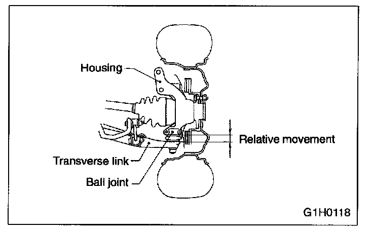 3. Next, grasp end of transverse link and move it up and down. Relative movement between housing and transverse link boss indicates ball joint may be excessively worn.