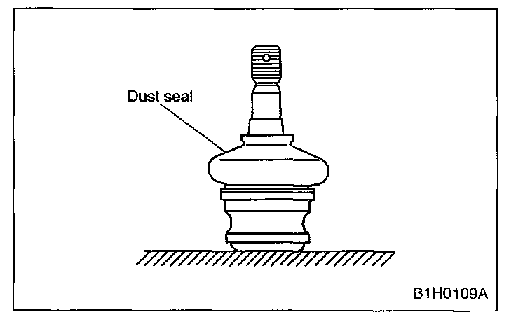 Inspect every 25,000 km (15,000 miles) or 12 months, whichever occurs first. Visually inspect ball joint dust seal. If it is damaged, remove transverse link. And measure free play of ball joint.