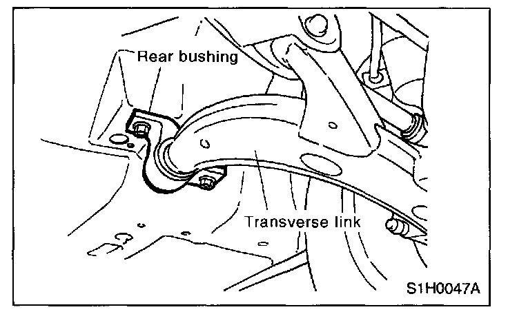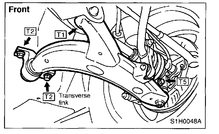 NOTE: When transverse link ball joint has been removed or replaced, check toe-in of front wheel. If front wheel toe-in is not at specified value, adjust according to chapter 4-1 so that toe-in conforms to service standard.