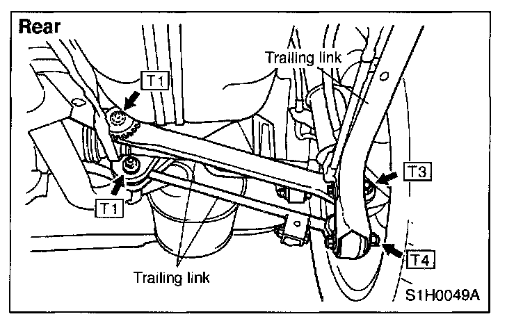 1. Check the following parts and the fastening portion of the car body for deformation or excessive rusting which impairs the suspension. If necessary, replace damaged parts with new ones. If minor rust formation, pitting, etc. are noted, remove rust and apply remedial anti-corrosion measures.