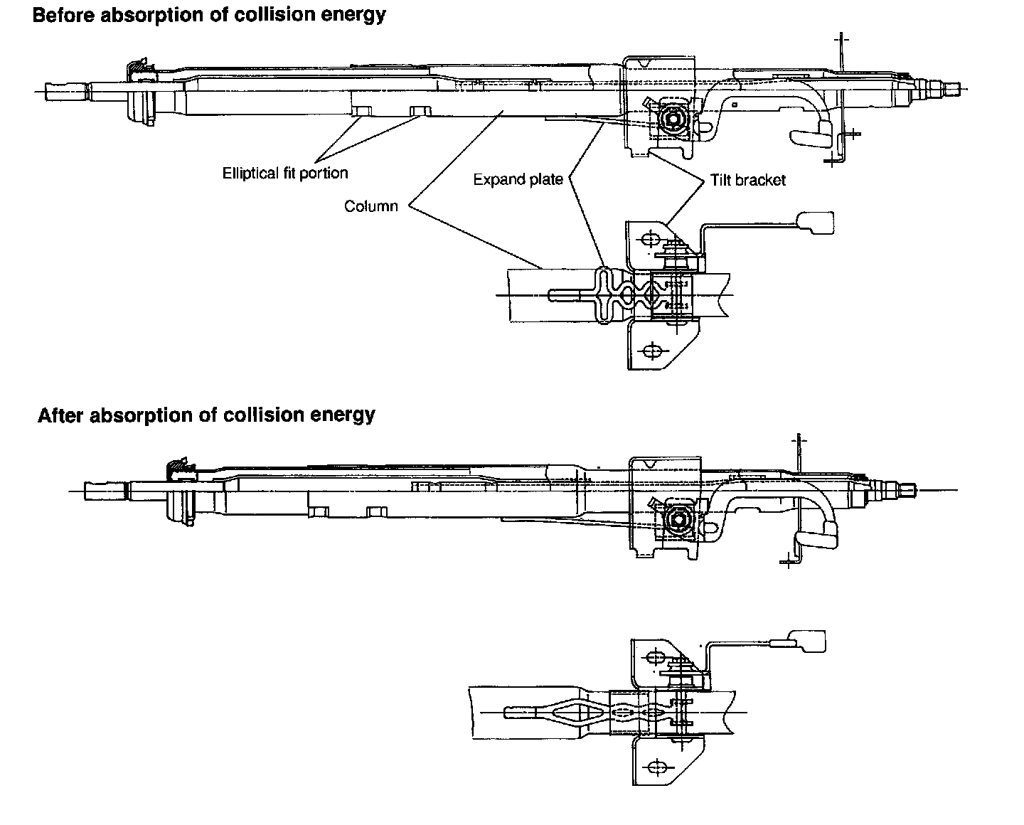 - To absorb the engine backward energy in the event of a collision, an elliptical fit type column pipe has been adopted. The energy is absorbed by collapse of the elliptical fit portions as their surfaces come in contact with each other and receive the bend load.