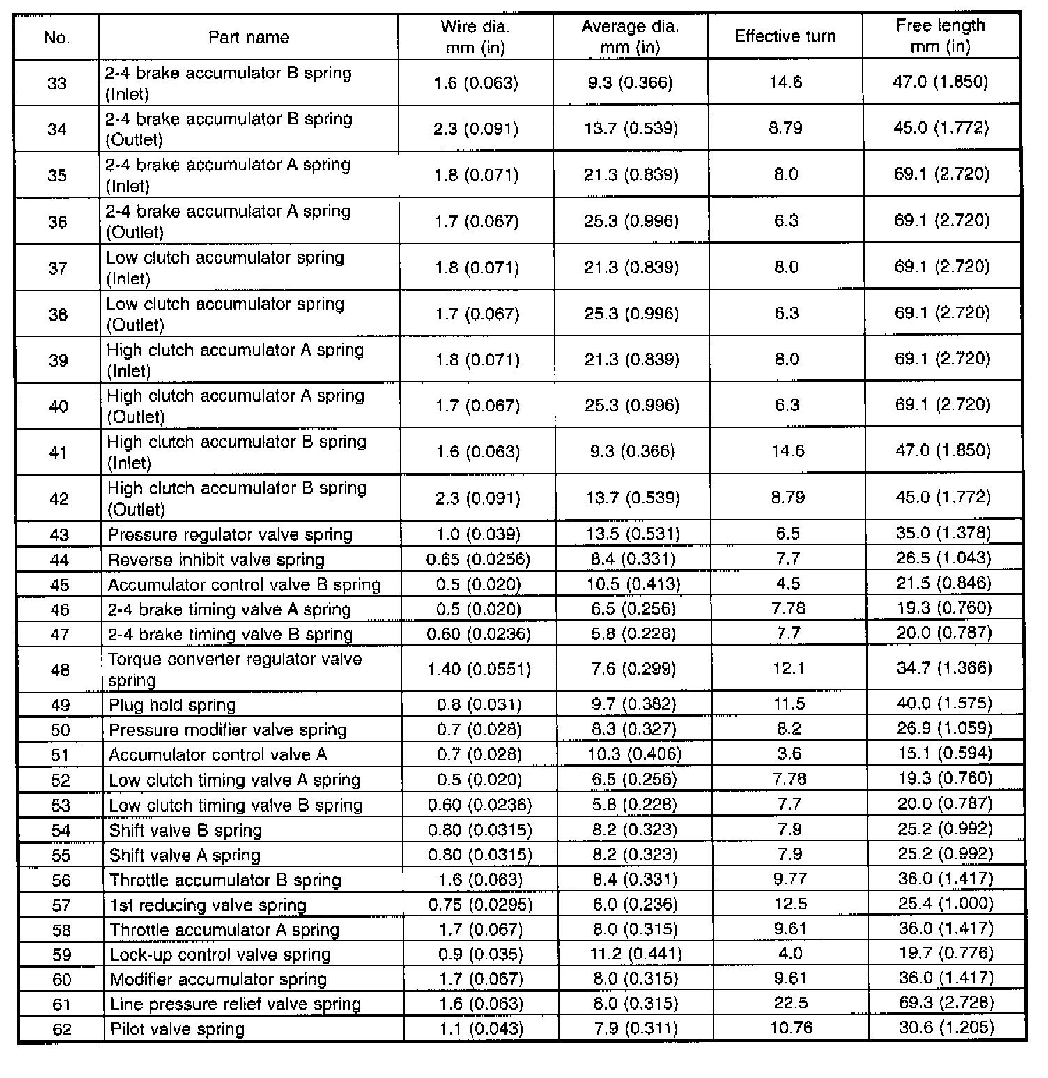 The control valve is composed of parts which are accurately machined to a high degree and should be handled carefully during disassembly and assembly. As these parts are similar in shape, they should be arranged in neat order on a table after disassembly so that they can be easily installed to their original positions. Spring loaded parts should be also handled carefully, as springs may jump out of place when the parts are disassembled or removed. Extreme care should be taken so as not to drop valves on the floor. Before assembling, the parts and valves should be dipped in a container filled with the ATF. Make sure that the valves are clean and free from any foreign material before assembly. Torque specifications should also be observed.
