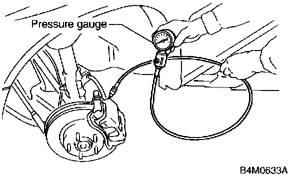 2. When using the pressure gauge, depress brake pedal so as to make the pressure gauge indicate 3,432 kPa (35 kg/cm2, 498 psi).