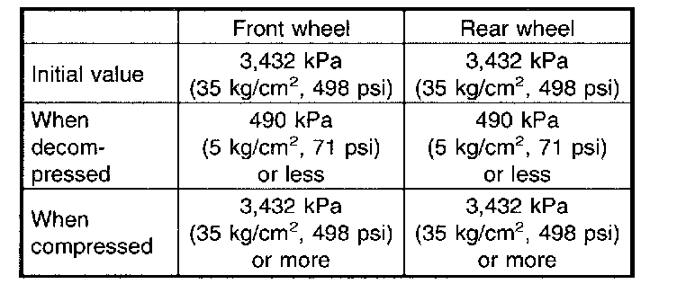 7. Read values indicated on the pressure gauge and check if the fluctuation of the values between decompression and compression meets the standard values. Also check if any irregular brake pedal tightness is felt.