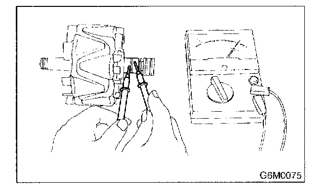 Inspect stator coil for continuity between stator core and each end of the lead wire. If there is continuity, the stator coil is short-circuited, and so replace stator assembly.