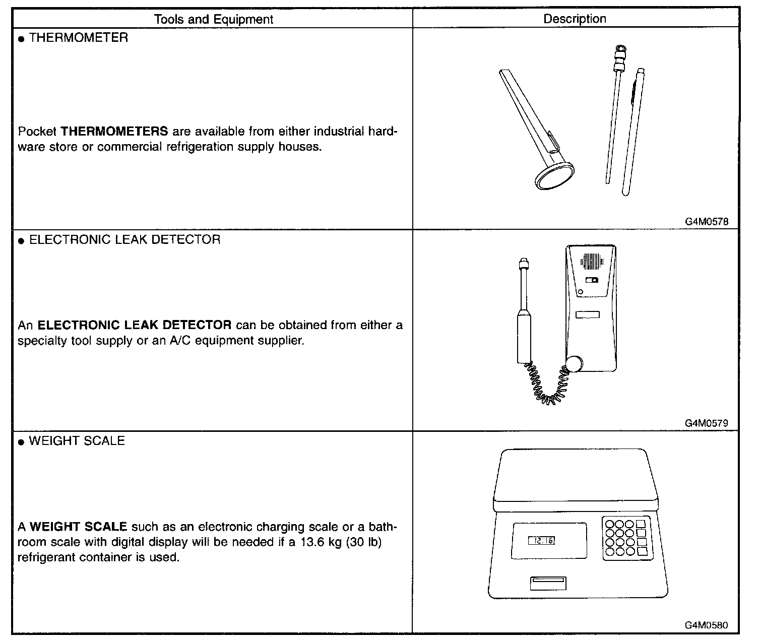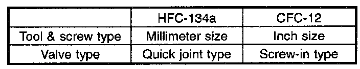 In order to help prevent mixing HFC-134a and CFC-12 parts and liquid, the tool and screw type and the type of service valves used are different. The gas leak detectors for the HFC- 134a and CFC-12 systems must also not be interchanged.