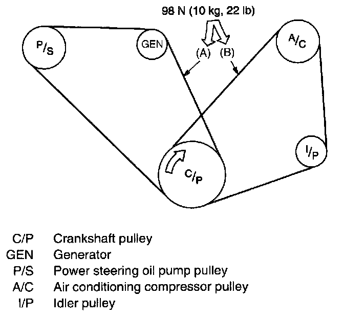 2. Check drive belt tension and adjust it if necessary by changing generator installing position and/or idler pulley installing position.