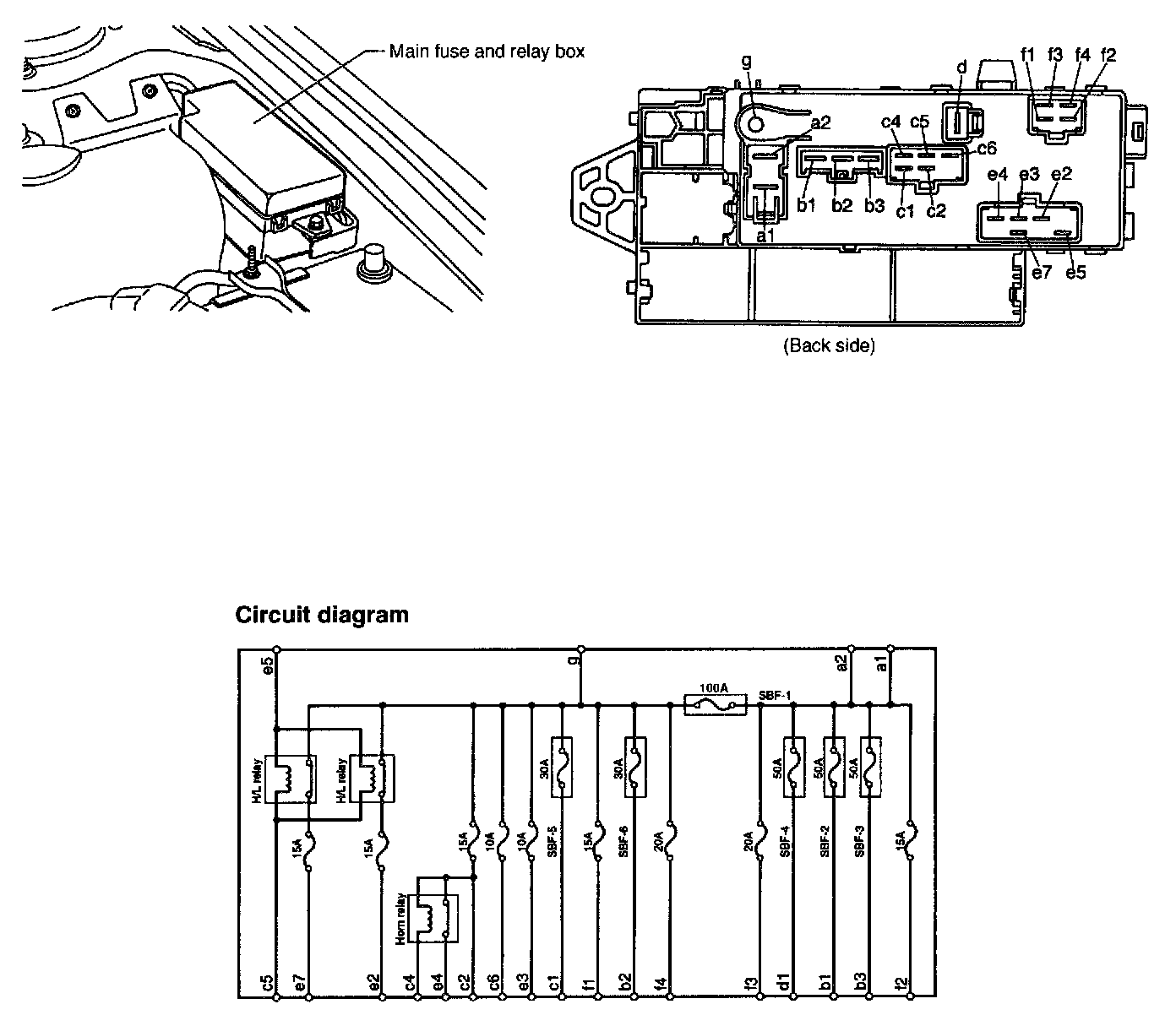 The main fuse and relay box is installed at the rear of the battery on left side of the engine compartment.