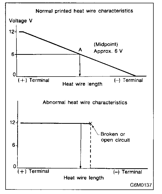 4. When tester indicates 12 volts when its probe reaches point "A", a broken circuit occurs between point "A" and the negative terminal. Slowly move tester probe toward the negative terminal while contacting it on heat wire to locate point where tester indication changes abruptly (0 volts). This is the point where a broken circuit occurs.