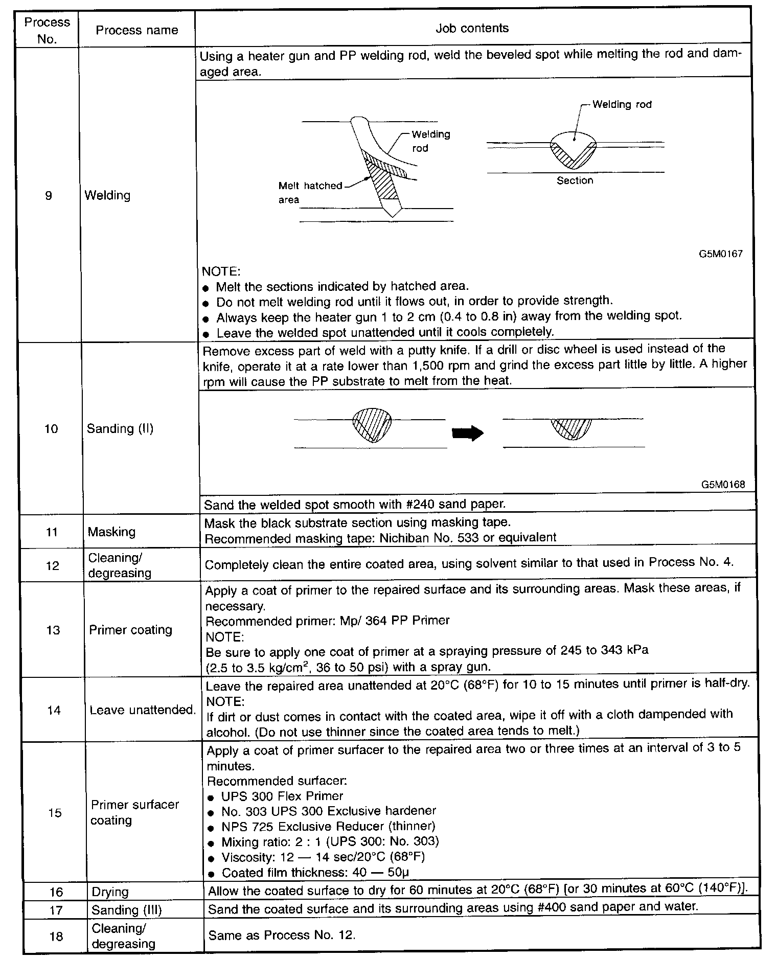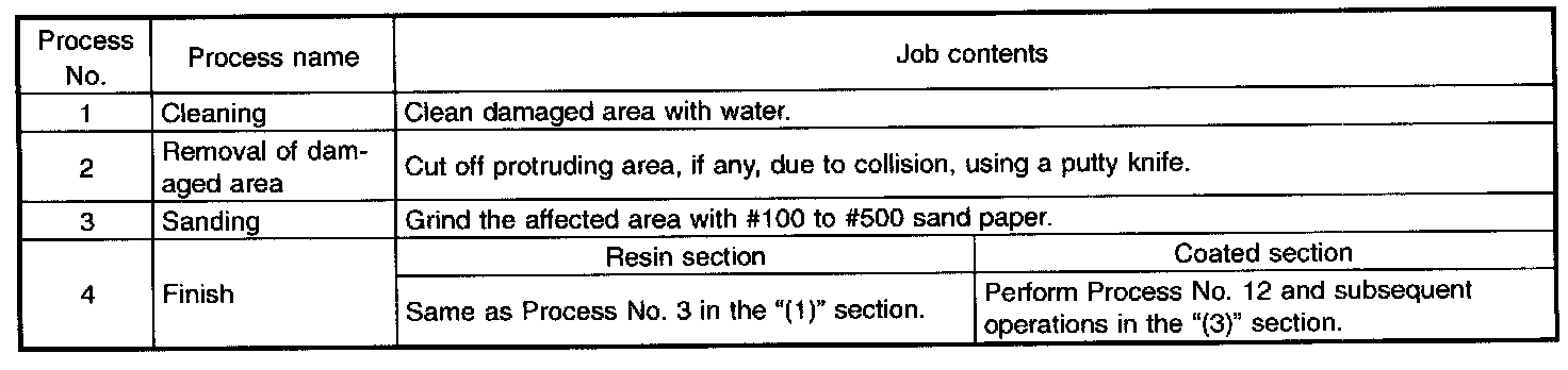 All PP bumpers are provided with a grained surface, and if the surface is damaged, it cannot normally be restored to its former condition. Damage limited to shallow scratches that cause only a change in the lustre of the base material or coating, can be almost fully restored. Before repairing a damaged area, explain this point to the customer and get an understanding about the matter. Repair methods are outlined below, based on a classification of the extent of damage.MINOR DAMAGE CAUSING ONLY A CHANGE IN THE LUSTRE OF THE BUMPER DUE TO A LIGHT TOUCH