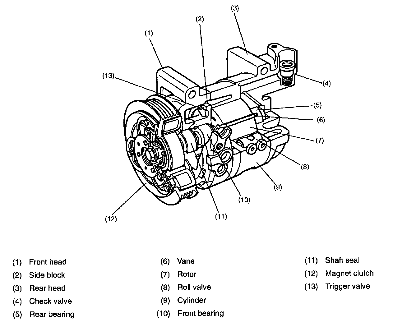 CompressorThe vane rotary type compressor has five vanes fitted in the rotor mounted on the shaft. The centrifugal force produced by rotation of the rotor in the elliptical cylinder causes the vanes to move out and change the volumes in the areas surrounded by the rotor and cylinder. Suction, compression and discharge take place 10 times per rotation. A roll type valve is used on the discharge side only. Shaft seals are provided for the shaft and front head to maintain air tightness in the compressor. A trigger valve is provided in the side block to apply a back pressure to the vanes. The compressor is charged with the specified quantity of compressor oil which is forced to all the parts for lubrication by the discharge pressure of the refrigerant.