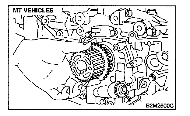 2. While aligning alignment mark on timing belt with marks on sprockets, position timing belt properly.