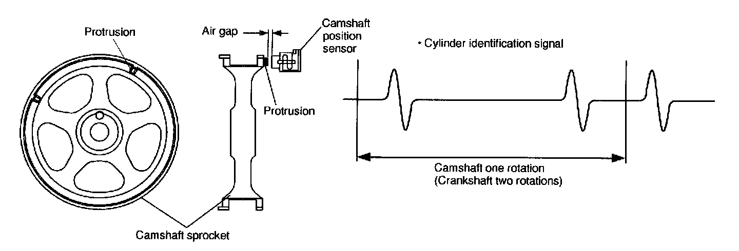 - It is designed so that the ECM accurately reads the number of pulses which occur when protrusions provided on the back of the left hand camshaft-drive sprocket cross the sensor. Internal construction and the basic operating principle of the camshaft position sensor are similar to those of the crankshaft position sensor. A total of seven protrusions (one each at two locations, two at one location and three at one location) are arranged in four equal parts of the sprocket, as shown.