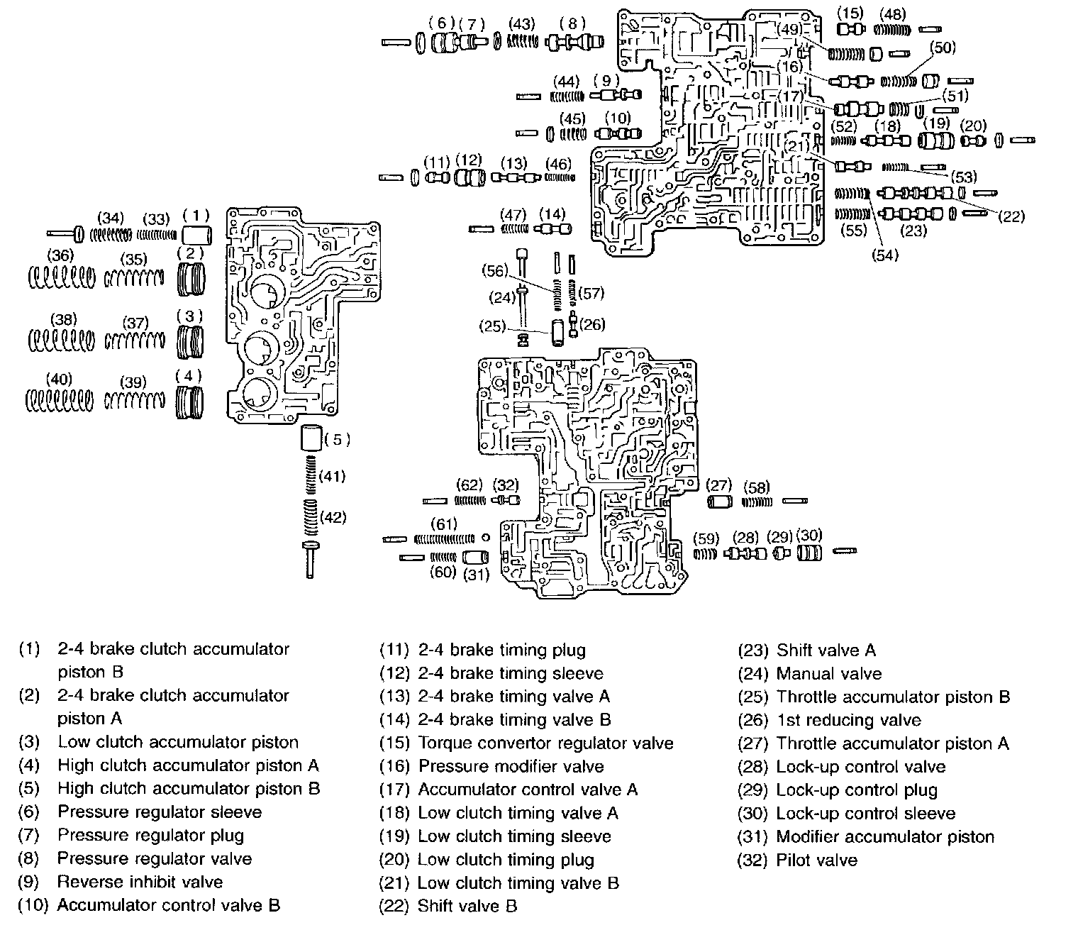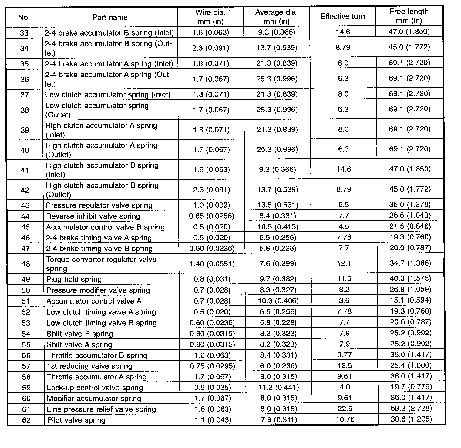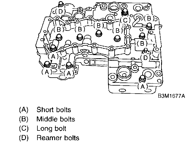 The control valve is composed of parts which are accurately machined to a high degree and should be handled carefully during disassembly and assembly. As these parts are similar in shape, they should be arranged in neat order on a table after disassembly so that they can be easily installed to their original Positions. Spring loaded parts should be also handled carefully, as springs may jump out of place when the parts are disassembled or removed. Extreme care should be taken so as not to drop valves on the floor. Before assembling, the parts and valves should be dipped in a container filled with the ATF. Make sure that the valves are clean and free from any foreign material before assembly. Torque specifications should also be observed.