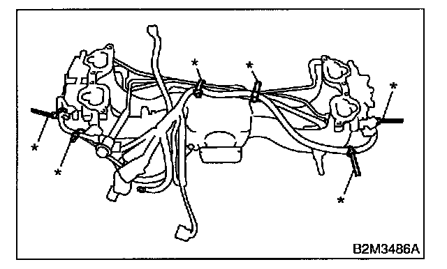 16. Remove harness bands (*) which hold engine harness onto intake manifold.