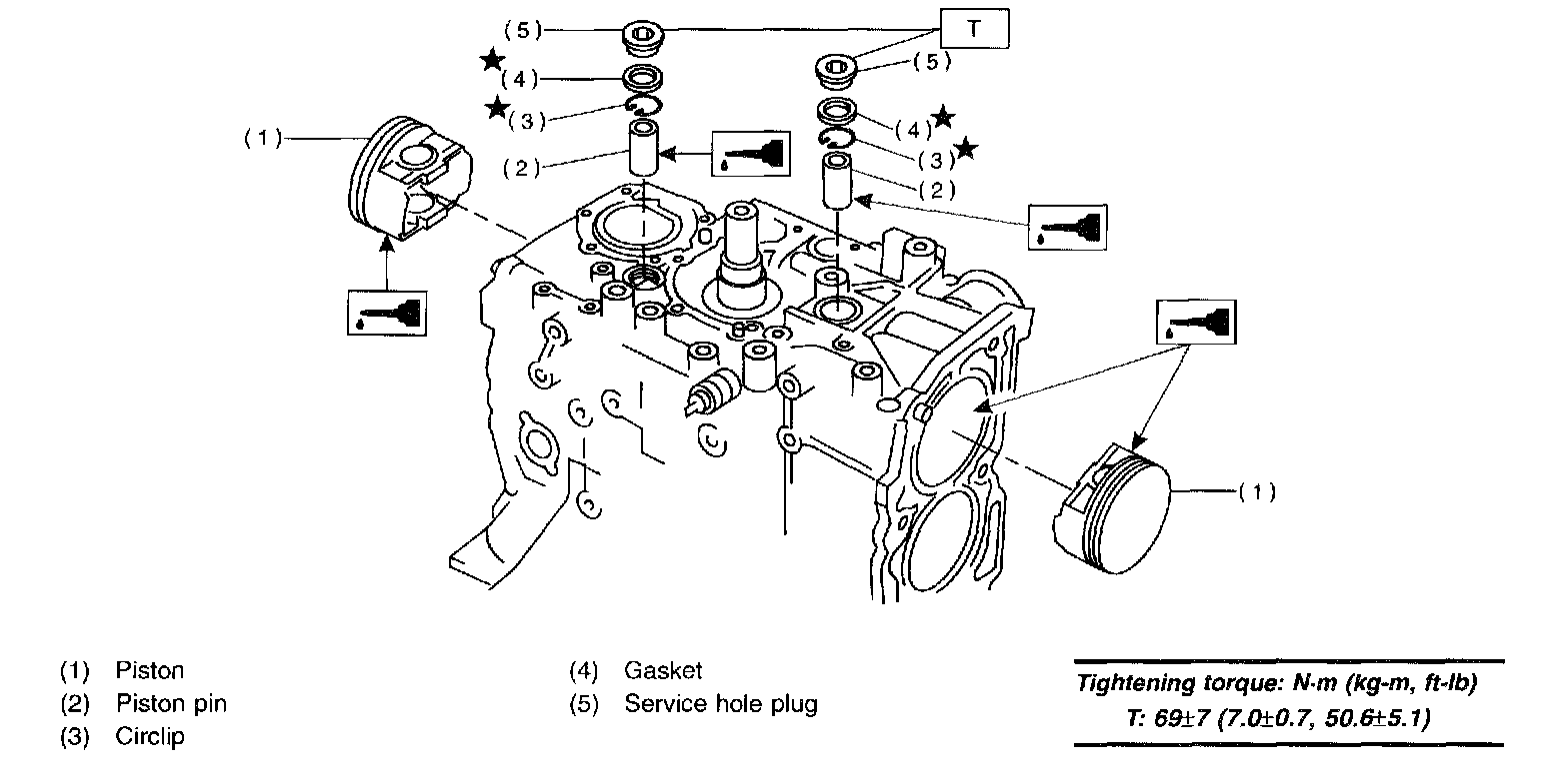 b. Apply a coat of engine oil to piston pin and insert piston pin into piston and connecting rod through service hole.