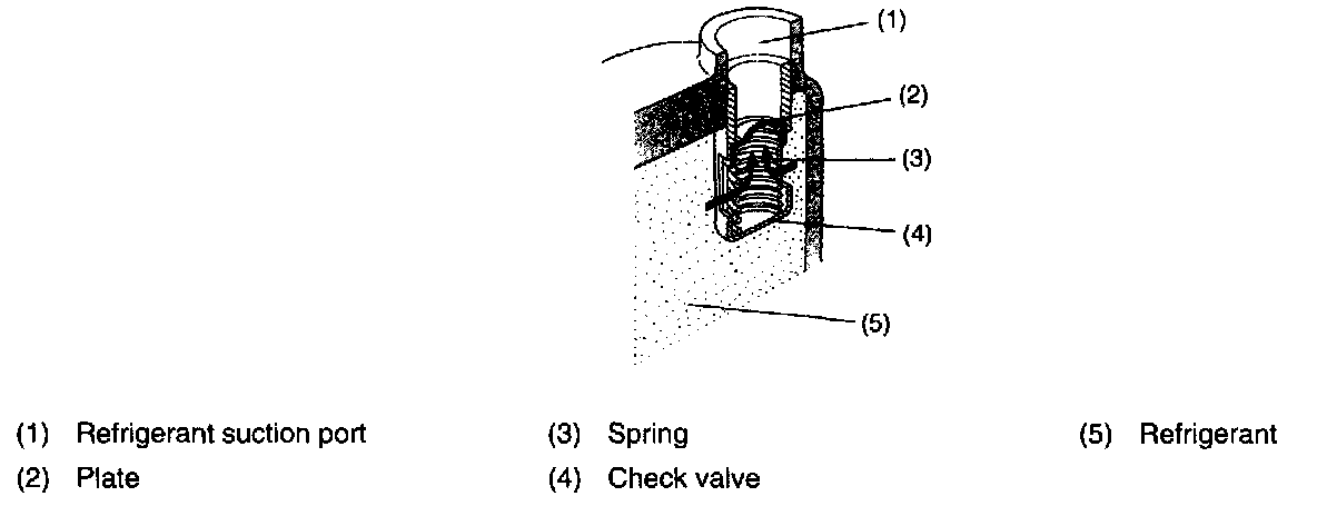 A plate and spring are provided on the suction side of the rear head. When there is a large difference between the high and low pressures immediately after the compressor has stopped, reverse rotation of the compressor could cause counter flow to the evaporator, as no suction valve is provided. For this reason, a check valve is provided to prevent counter flow. Immediately after the compressor has stopped, the high pressure refrigerant forces the check valve up to close the suction side piping passage and prevent counter flow from the high to low pressure side.